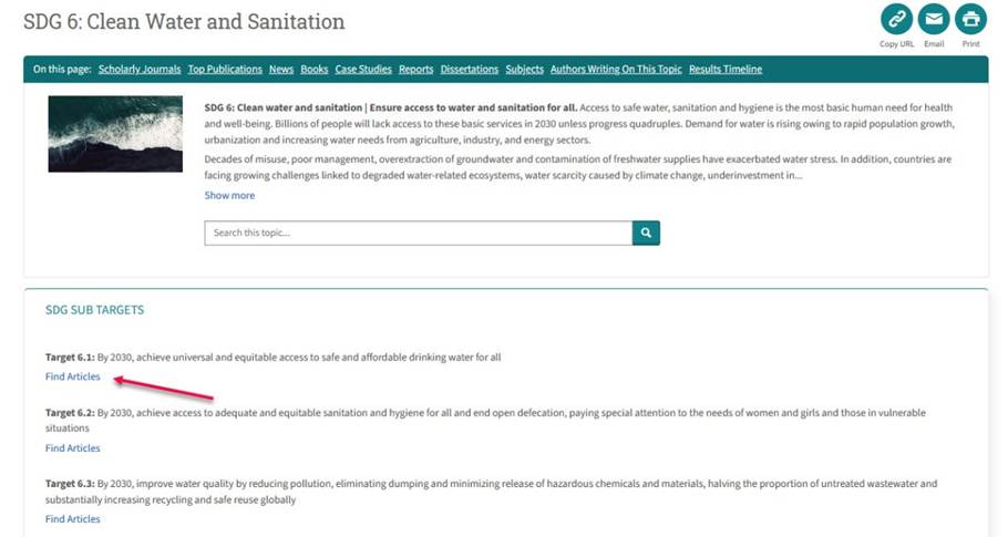 How does this feature work? The database highlights research that relates to each of the 17 goals by listing the goals on the database’s home page. When you click on a specific goal (e.g. “Goal 6: Clean Water and Sanitation”), the database lists the targets within each goal (e.g. “Target 6.1: By 2030, achieve universal and equitable access to safe and affordable drinking water for all”). You can click on “Find articles” to view the literature that addresses this specific target. In the image below, you can see what the “Find articles” link looks like in the database.