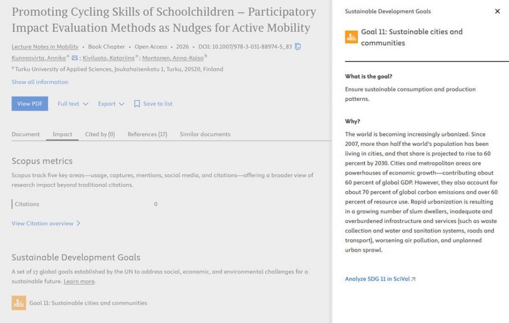 When you run a search, say for cycling in cities, Scopus has incorporated the goals within the description of literature that addresses one or more of the goals. Scopus will help you identify which research articles address the SDGs by indicating, under the “Impact” section of each document’s record, when the research relates to one or more SDGs. Scopus uses machine learning to help identify which articles discuss which SDGs. For example, in my Scopus search: cycling and cities, I found an article on promoting cycling to schoolchildren and after choosing the “Impact” tab, I found that the article mapped to “Goal 11: Sustainable Cities and Communities.” Scopus also gives a summary of what each goal is about and why it is important. Here is what Scopus looks like in action: