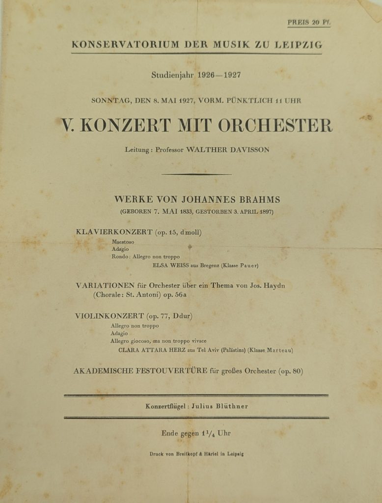 While many documents in this collection pertain to her life as a musician here in Montreal, there are many strong ties to Jewish musical life in Mandatory Palestine. Through program notes and concert posters, a lot can be learned about musical trends both at home and abroad. Not only are there programs from performances Hertz Berkson had been a part of, but there are also many programs from those of her mother, Atara Glickson Herz. Glickson Herz studied in Leipzig in the early 1920s with Henri Marteau; after her studies, she returned to Mandatory Palestine where she performed opera, chamber music, and solo works. The collection therefore contains programs from Glickson Herz’s examinations at the Konservatorium der Musik zu Leipzig, her career in Tel Aviv, and performances she attended.