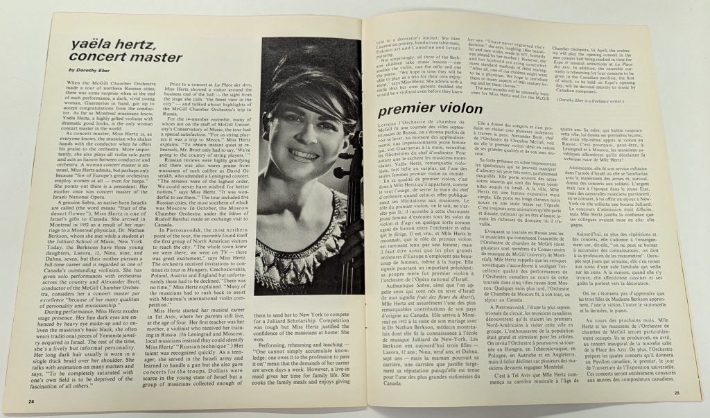 One of the unexpected joys of this project has been encountering ephemera from Expo 67 held in Montreal. Expo 67, officially known as the 1967 International and Universal Exposition, was a World’s fair held in Montreal from April to October 1967, the year of Canada’s centennial. As music was a prominent feature of the Expo, the McGill Chamber Orchestra had an opportunity to perform, and, as concertmaster, Hertz Berkson attended the Expo for both work and fun! In recognition of her position as concertmaster, she was featured in a magazine spread in the Montreal Expo 67 magazine.